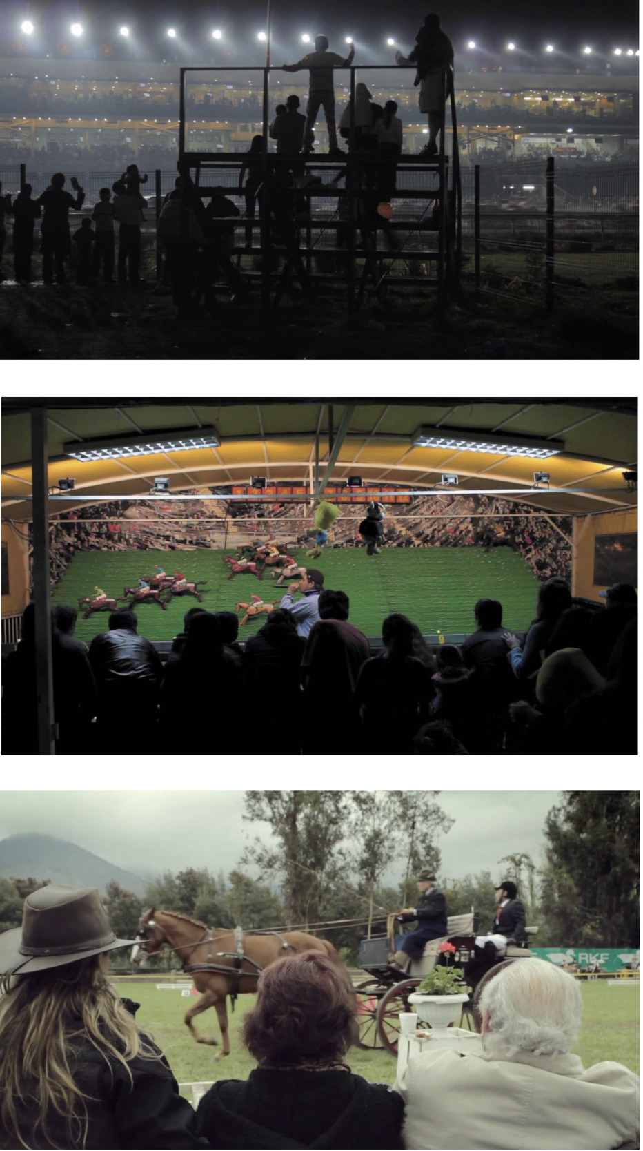 A trio of MAFI films centered on the sport of horseracing share a close connection to both Gay’s representation of the pastime in his Atlas and Historia. Antonio Luco’s Octava carrera (2011), Christopher Murray’s Carrera de caballos pequeños (2011), and Daniela Camino’s Vida social: campeonato de carrozas (2012) illustrate horseracing’s appeal in 21st-century Chile, while echoing the self-reflexive sensibility of Gay’s Atlas. Like Una carrera en las lomas de Santiago, these three Mapa Fílmico films depict horseracing as a leisure activity that appeals to Chileans across social classes. However, rather than presenting horseracing as a unifying pursuit as Gay does, these films present the sport as a reflection of the country’s social divisions and high levels of socioeconomic inequality.[32]