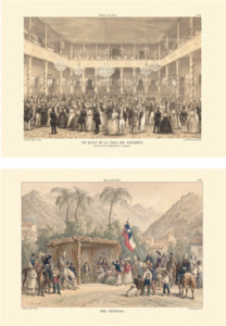 Gay’s Atlas also highlights the social practices of Chileans across social strata. Two adjacent illustrations by Gay and Lehnert exemplify the Atlas’s representation of a broad swathe of Chilean society. The first of these, Un baile en la Casa del Gobierno, (Atlas de la historia física y política de Chile 28), shows a formal ball underway in a spacious and well-appointed hall on the occasion of the Independence Day celebrations on September 18. Men dressed in tails dance with women in elegant gowns beneath crystal chandeliers. The subsequent image features a less glamorous tradition with rural roots. Una chingana (Atlas de la historia física y política de Chile 29) shows an open-air, straw-thatched shack amid a mountainous valley. Inside the small edifice a group of female musicians perform to a group of revelers situated outside who dance the cueca and imbibe beneath a Chilean flag. The historian Brian Loveman describes the chingana as a redoubt of the lower classes, “a combination of bar, dance hall, and brothel” (103). In the first volume of Agricultura (1862) of his Historia, Gay depicts the chingana as a source of vice for campesinos, “En las cercanías de Santiago, etc., el trabajo es más continuo, pero el sábado, que es el día de pago, pasan su tiempo en las chinganas o en el juego y todo lo que han ganado en la semana desaparece a veces en algunas horas” (Atlas de la historia física y política de Chile 103). Gay’s illustration Una chingana represents a (morally dubious) microcosm of the Chilean nation. It is a space of social mixing where huasos, landowners, and campesinos revel together under open skies and the national flag.[31]